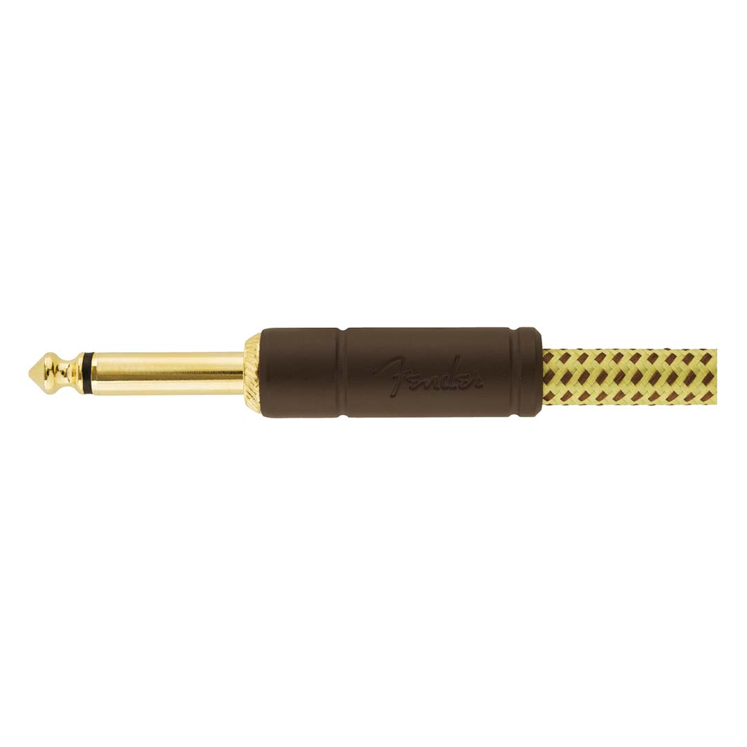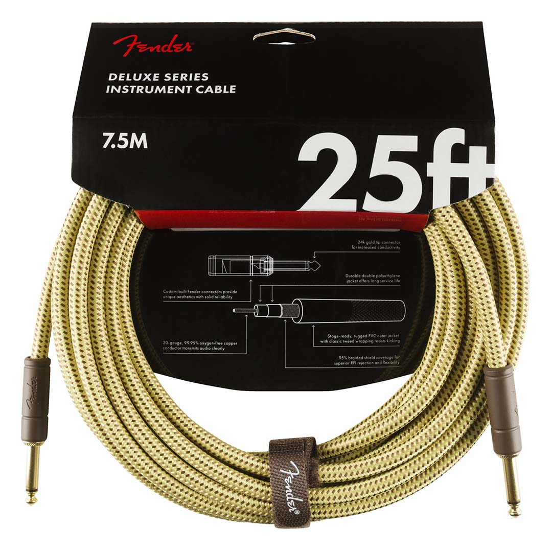 Fender Deluxe Series cables carry the highest quality materials and braided shielding to deliver flagship durability, conductance and transparency. Our top-of-the-line cables sport custom molded ends with strain relief under the housing – plus 24K gold-plated connectors that won’t tarnish or degrade your sound over time. These cables use a very quiet braided shielding that is engineered to maximize the purity of your tone, and they’re protected by a soft-woven yet rugged tweed jacket that provides ultimate protection with classic Fender style.