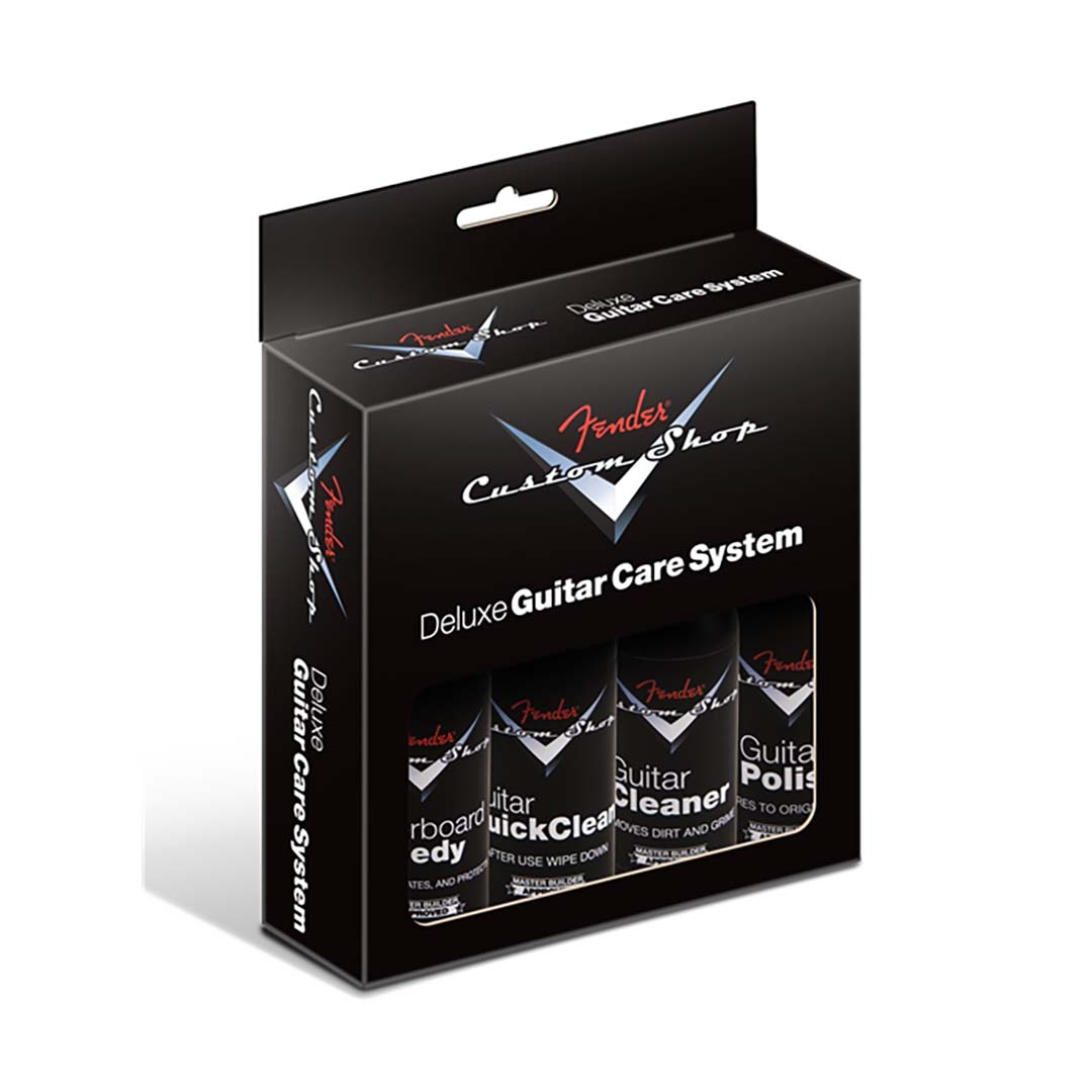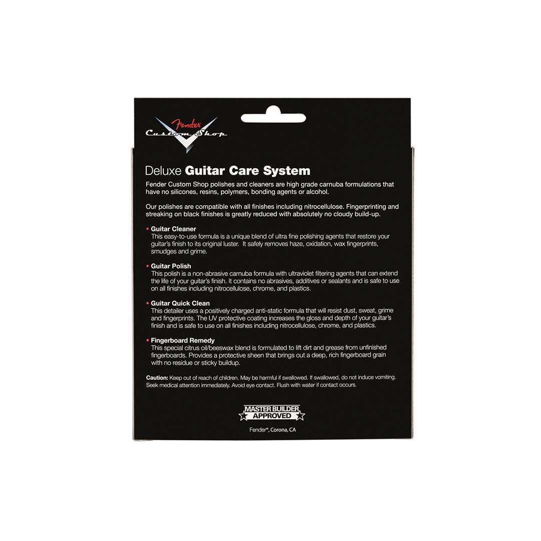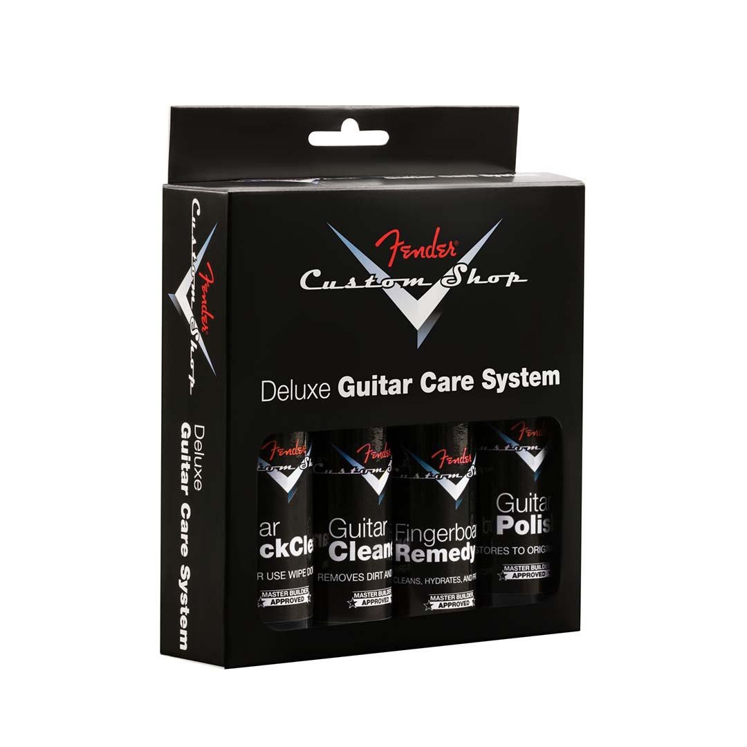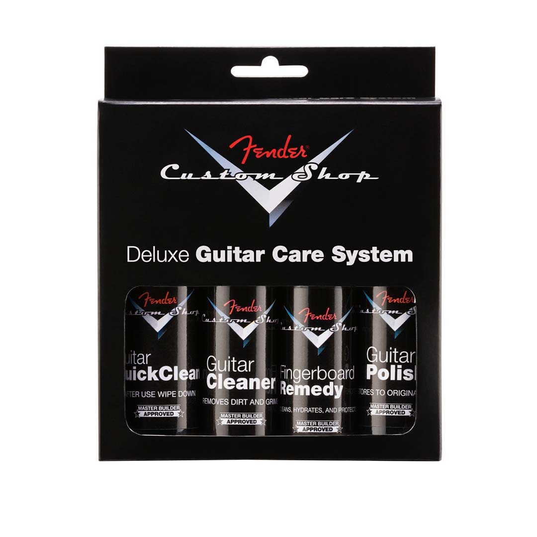Keep that sheen pristine with this reliable four-step cleaning kit. Utilized by the same builders who craft our striking Custom Shop instruments, this four-step kit contains one bottle of each Fender Custom Shop Guitar Care product: Cleaner, Polish, Quick Clean and Fingerboard Remedy.These high-grade carnauba formulations contain no silicones, resins, polymers, bonding agents or alcohol. Fingerprinting and streaking on black finishes is greatly reduced, with absolutely no cloudy build-up.