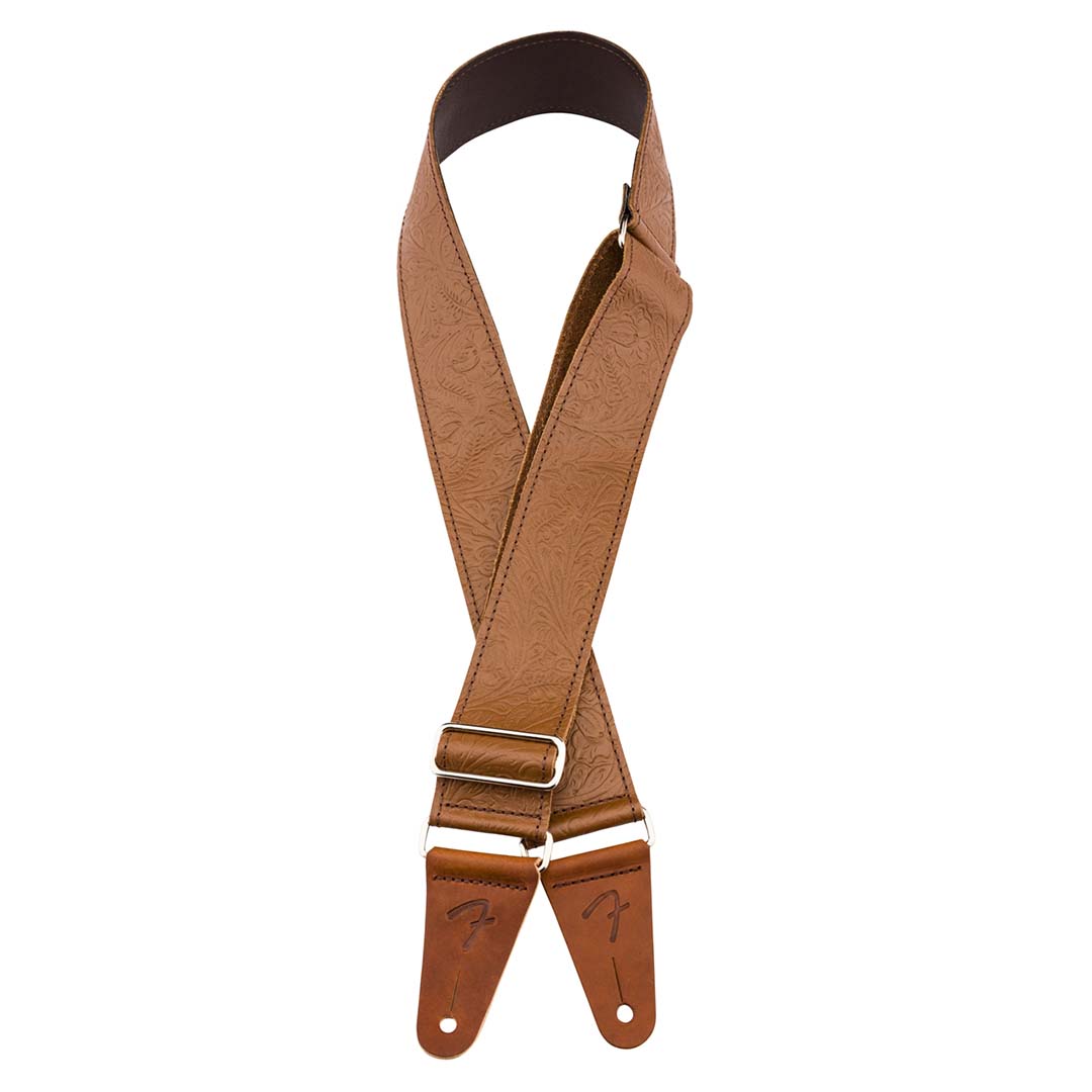 Inspired by the highly decorated straps favored by Western swing and country players, the Tooled Leather Strap brings classic style to any performance. Featuring an attractive floral pattern, this 2″-wide strap is designed for comfort, quality and aesthetics. The premium leather cone ends feature an embossed “F” logo to maintain the theme. The silver nickel slider allows the strap to adjust from 42″-52″ in length to accommodate players of any stature.