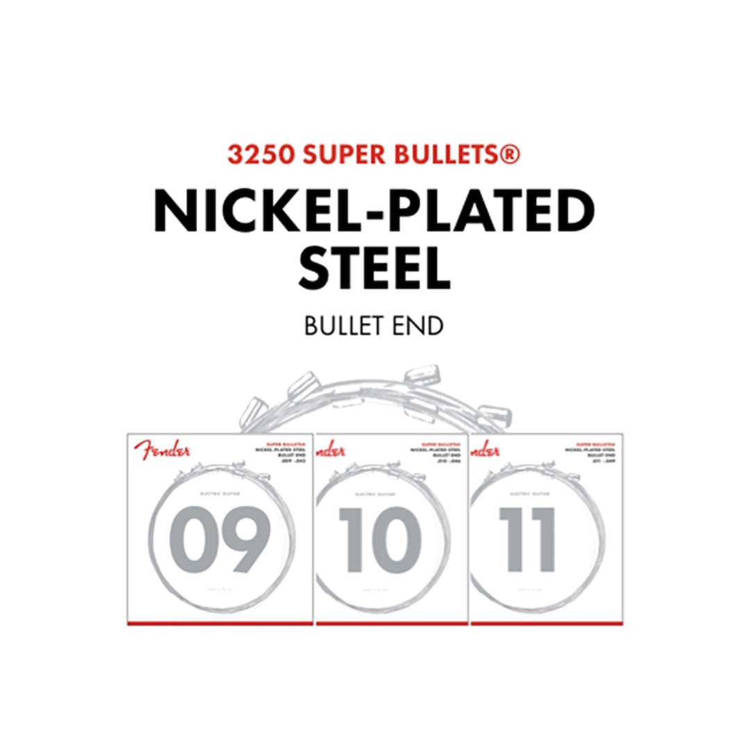 Combine the high output and dynamic sound of steel with the smooth feel of nickel. Our signature Super Bullets® are perfect strings for rock and other kinds of music requiring cutting guitar. Best of all, the patented bullet end creates a sonic coupling between the string and the bridge block, offering rock-solid tuning stability and increased sustain.3250L: .009, .011, .016, .024, .032, .0423250LR: .009, .011, .016, .026, .036, .0463250R: .010, .013, .017, .026, .036, .0463250M: .011, .014, .018, .028, .038, .049
