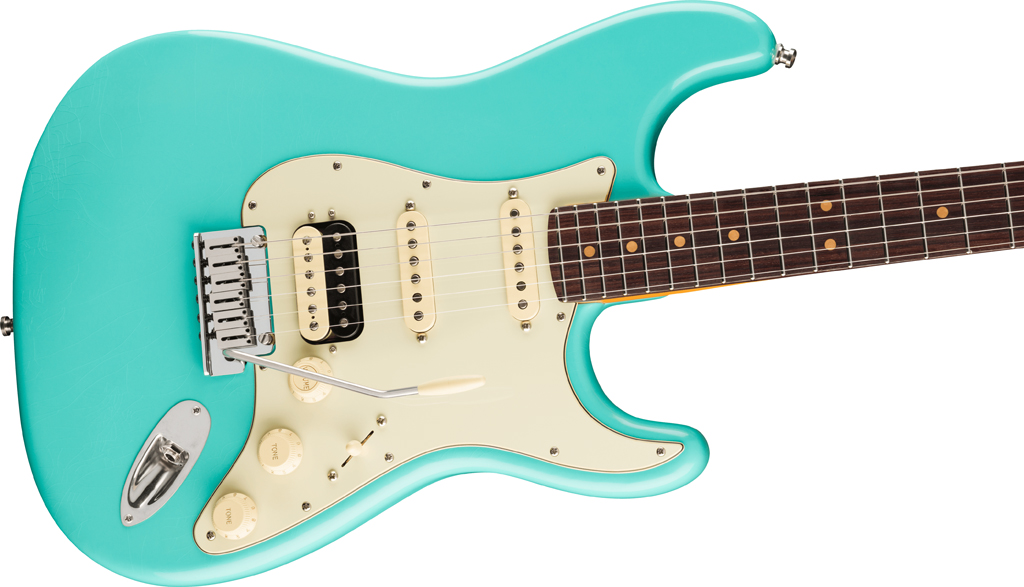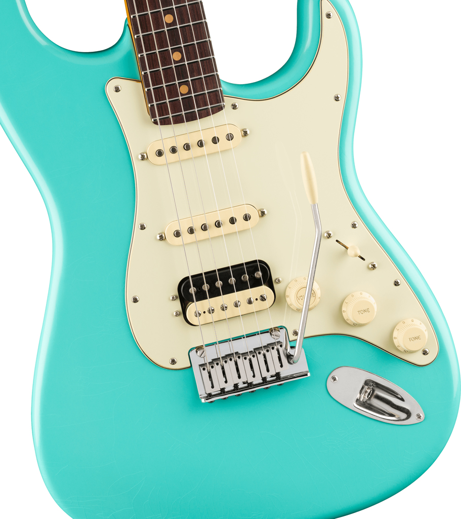 Under the hood, Pure Vintage ’61 Strat® single-coils deliver classic Fender tones, from sparkling cleans to rich, expressive leads while the Haymaker™ humbucker brings powerful, articulate crunch. Performance hardware includes a precision-engineered 2-Point American Ultra synchronized tremolo with polished stainless steel block saddles, cold rolled steel block, and deluxe locking tuners for quick string changes and superior tuning stability.