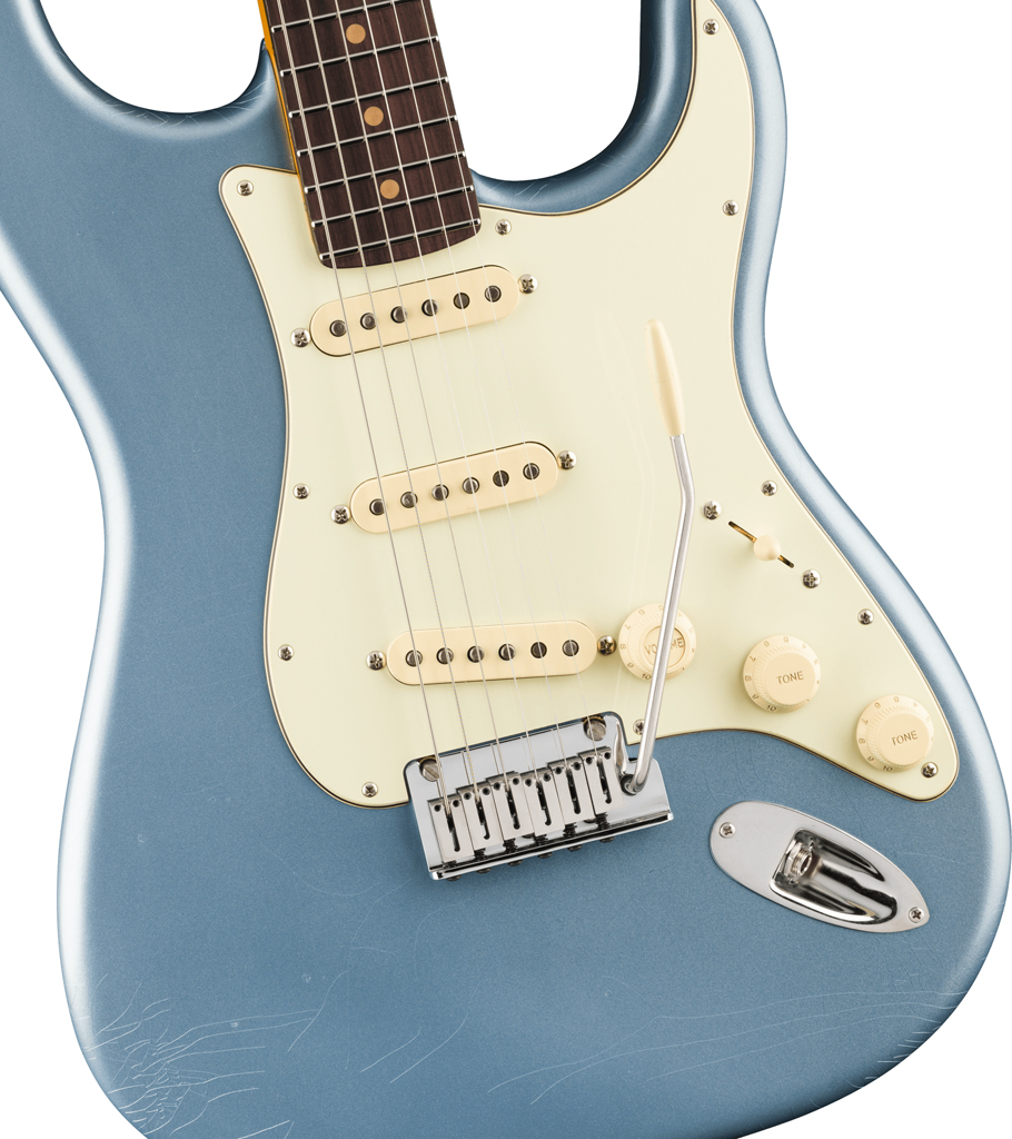 Under the hood, Pure Vintage ’61 Strat® deliver classic Fender tones, from sparkling cleans to rich, expressive leads. Performance hardware includes a precision-engineered 2-Point American Ultra synchronized tremolo with polished stainless steel block saddles, cold rolled steel block, and deluxe locking tuners for quick string changes and superior tuning stability.