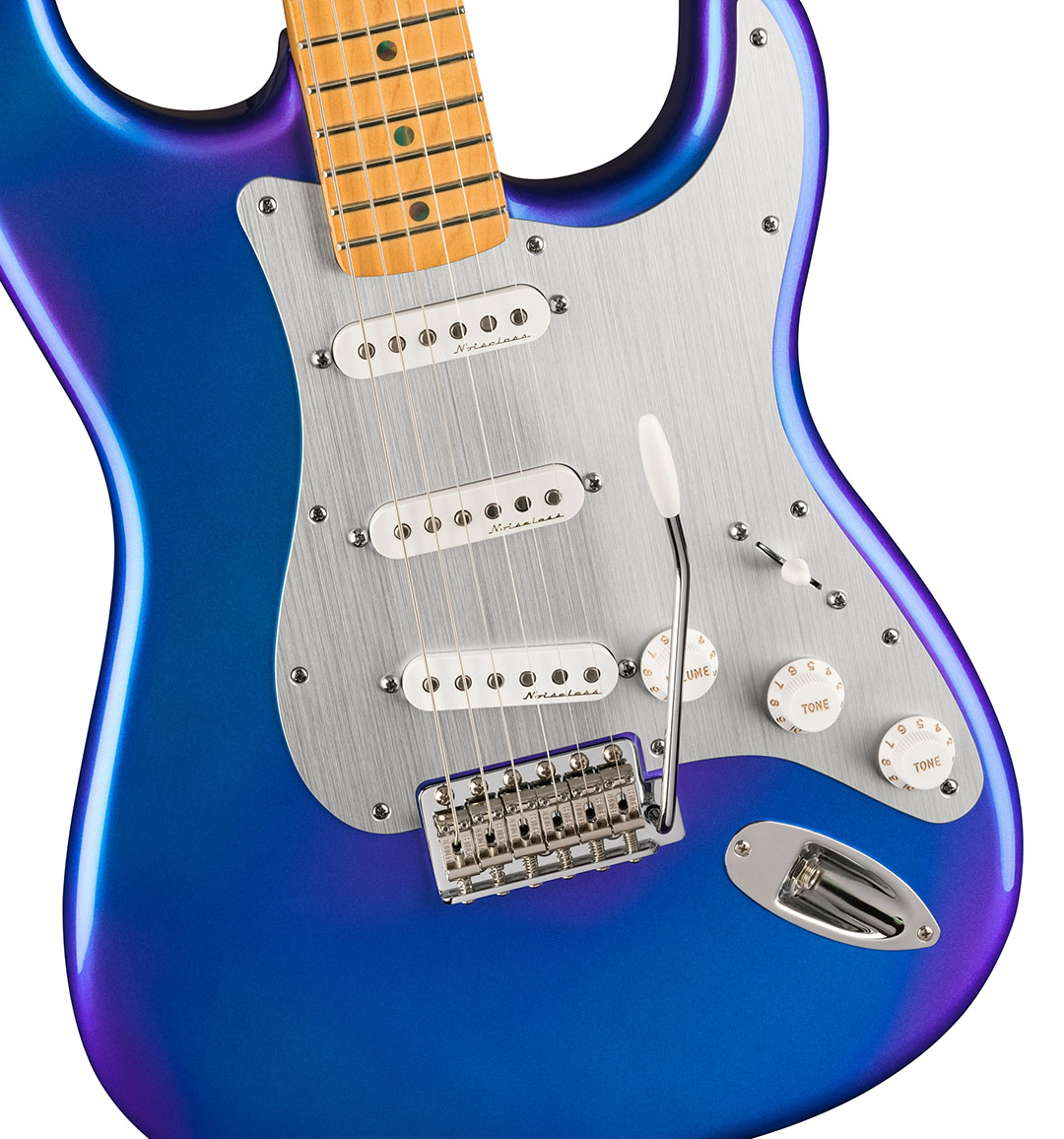 Dynamic R&B performer H.E.R. has wooed audiences and earned Grammys with her powerful performances and emotional songs – her smooth rhythms and slow-burning solos always at the forefront.The H.E.R. Stratocaster® makes a statement as bold as the artist who inspired it. Finished in dazzling Blue Marlin and featuring a mid-’60s “C” shape maple neck, Vintage Noiseless™ pickups and an anodized aluminum pickguard, this guitar delivers effortless playability, classic Strat® tone and extraordinary good looks.