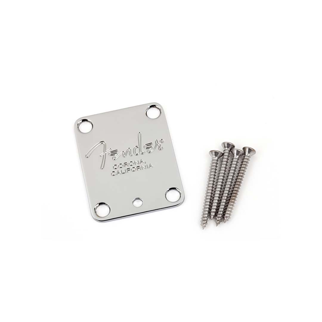 Neck plate stamped with “Fender® Corona California” and including hole for Micro-Tilt™ neck-tilt adjustment. Fits most Fender guitars using four-screw neck mounting with Micro-Tilt. Mounting hardware included.