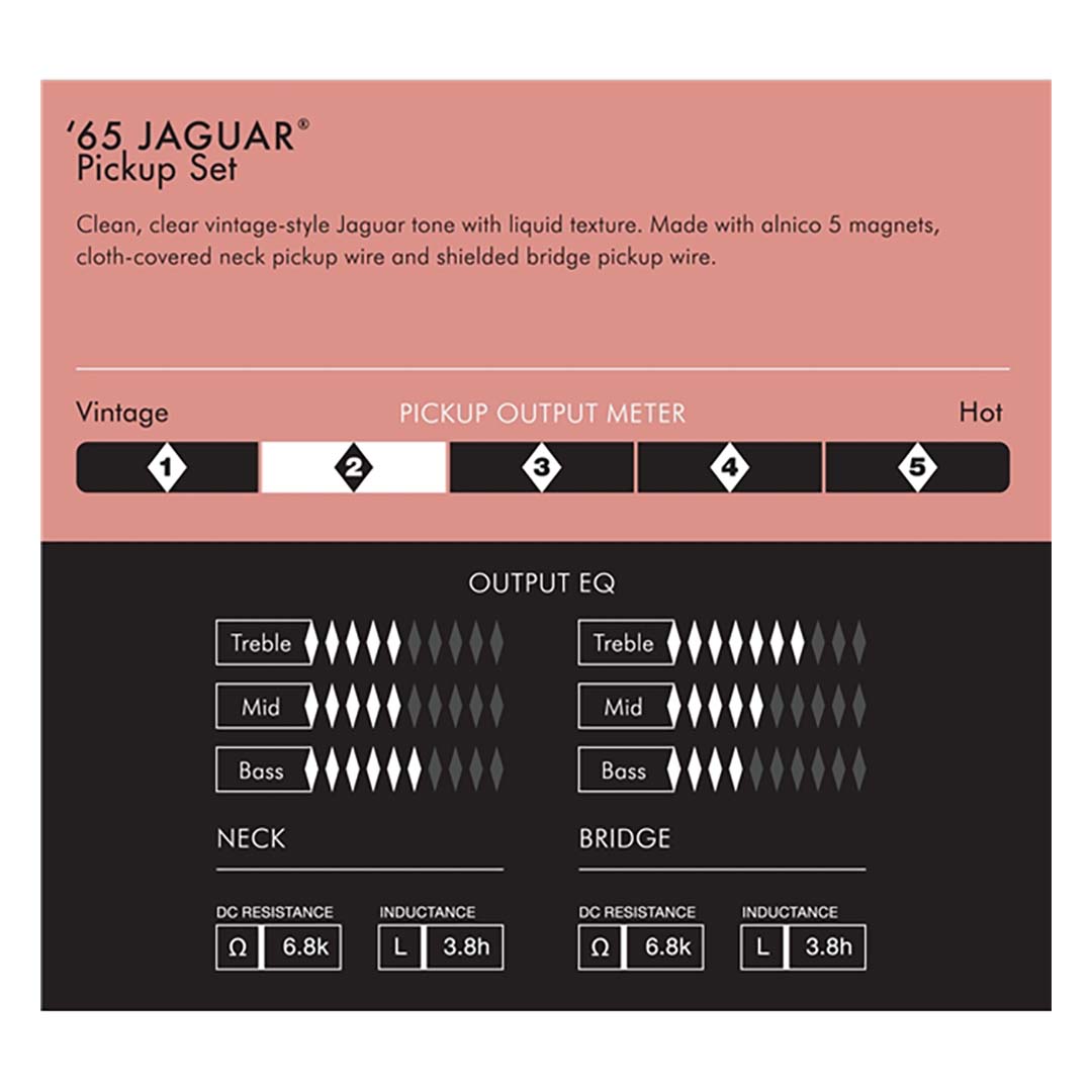 From vintage bobbin construction to genuine original-era cloth wiring, all Fender Pure Vintage pickups are wound to precise specifications for authentic, traditional Fender tone and performance. Achieve the clean and clear sound of the mid-’60s Jaguar model, with vintage-correct pickups that exude the same liquid-hot tone and snarling angular attitude as the ax that sparked surf rock.