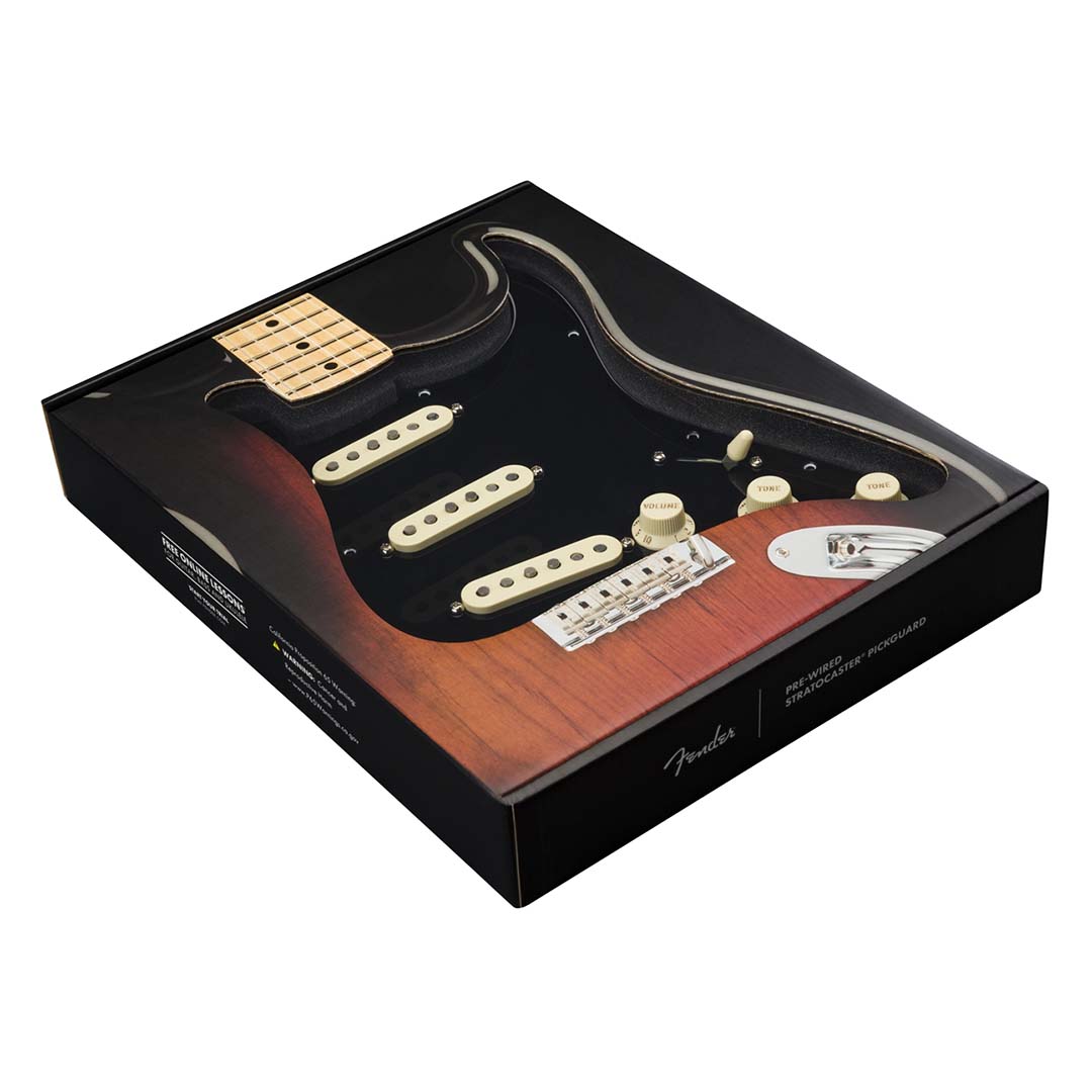 Customize your tone with the Pre-Wired Stratocaster pickguards. Made with premium components in the same factory as our iconic guitars, this drop-in pickguard is easy to install. Simply remove your old guard, solder the output jack and ground wires, screw in the new guard and you’re ready to rock with pure Fender sound.