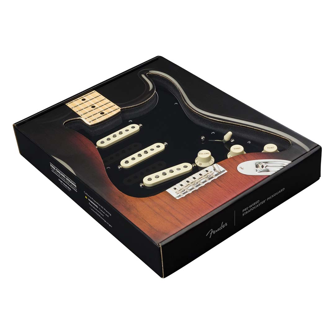 Customize your tone with the Pre-Wired Stratocaster pickguards. Made with premium components in the same factory as our iconic guitars, this drop-in pickguard is easy to install. Simply remove your old guard, solder the output jack and ground wires, screw in the new guard and you’re ready to rock with pure Fender sound.