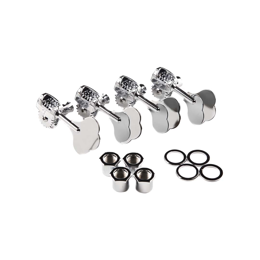 Set of four chrome tuning machines with Fender “F”-logo casing stamps, for use on modern Precision Bass®, Jazz Bass® and Dimension™ bass models, including American Standard basses manufactured from 2007-present and American Deluxe basses manufactured from 2009-present. Bushings and mounting hardware included.